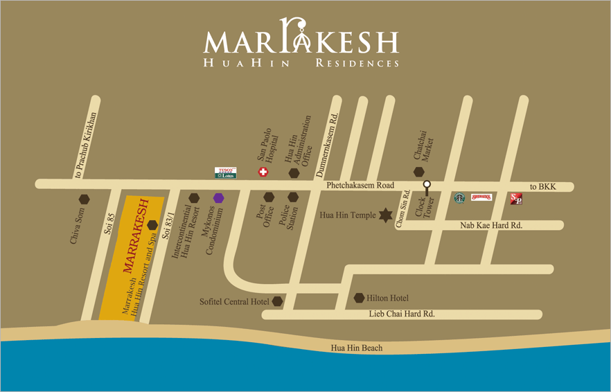 มาราเกช หัวหิน เรสซิเดนเซส ที่พักหรูใจกลางเมืองหัวหิน ติดชายหาดหัวหิน พร้อมสระว่ายน้ำยาวกว่า 240 เมตร ใกล้ตลาดหัวหิน เพียง 5 นาที จากไนท์มาร์เก็ต 2 นาที จากสวนศรี ทะเลตรงนี้เหมาะแก่การเล่นน้ำ หาดทรายสวยมาก มีสวนน้ำ สนามเด็กเล่น พร้อมสระว่ายน้ำ 3 ฟังก์ชั่น สระว่ายน้ำเด็กพร้อมสไลเดอร์ และ Jacuzzi ในลูกสับปะรด 6 จุด ไม่รวมอาหารเช้า